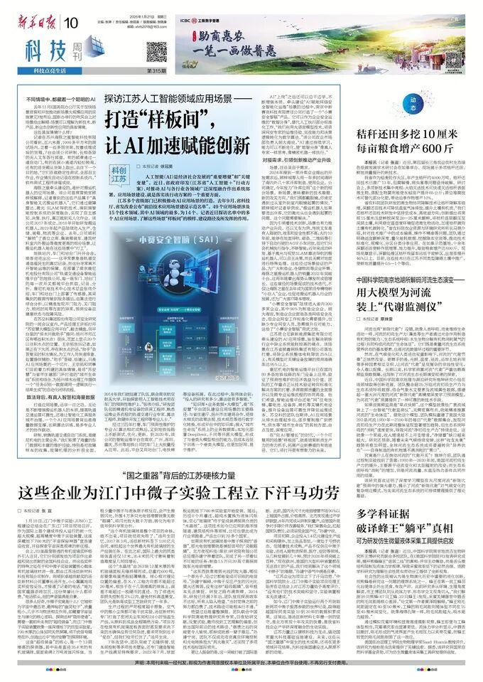 2026年1月21日,《新华日报》以《探访江苏人工智能领域应用场景——打造“样板间”, 让AI加速赋能创新》为题,报道了金年会等入选江苏省“前沿技术应用场景建设示范名单”企业,在应用场景建设方面的实践与成效。